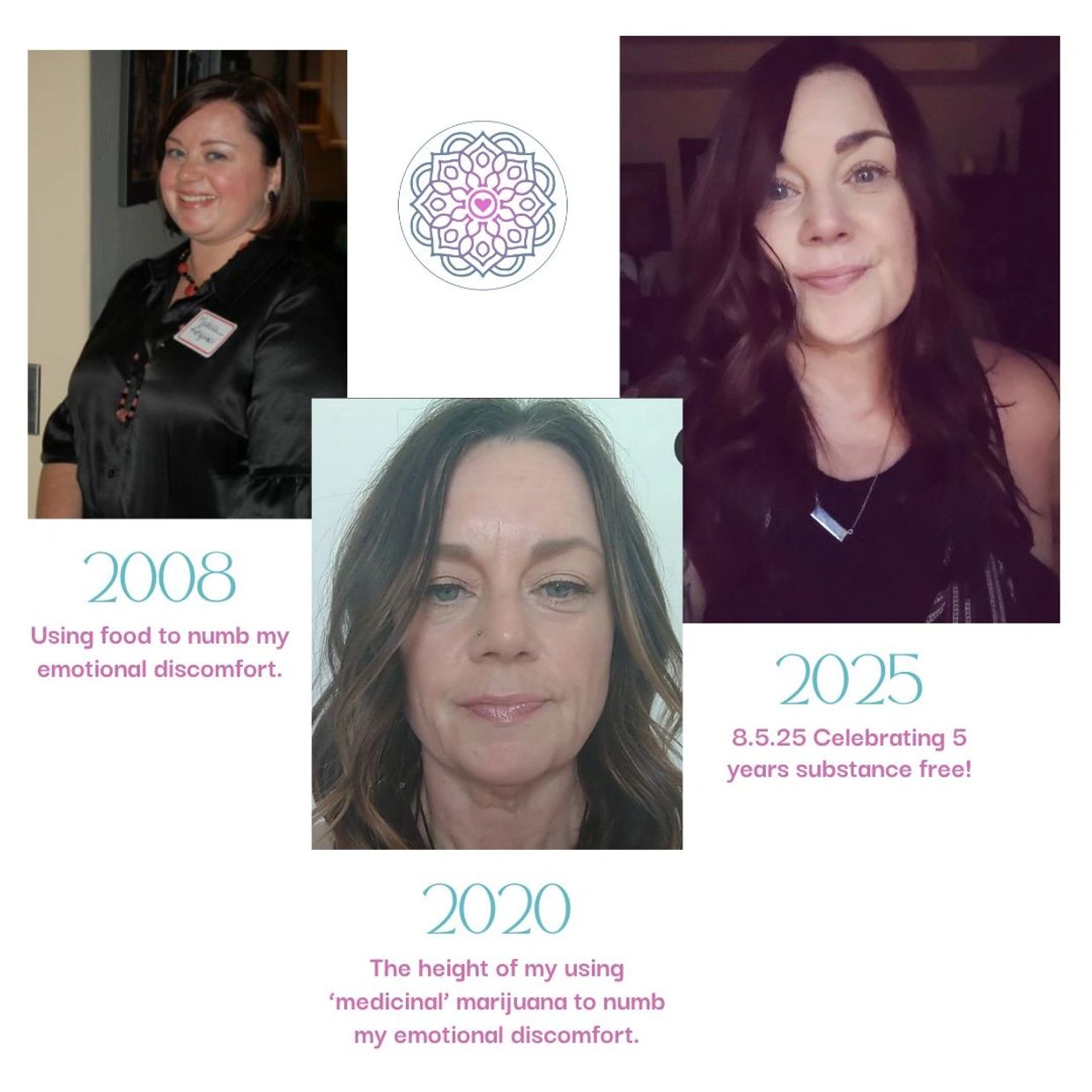 With more time in my practice, I realized that there was still emotional discomfort in my life that I was avoiding. I turned to 'medicinal' marijuana to NUMB (middle picture). I began to realize that just like food, I was overusing something to escape, avoid, and numb. On August 5, 2020 I attended my first meeting. The literature states ~ "There is only one requirement for membership, a desire to stop using." I wanted to stop numbing and start living.